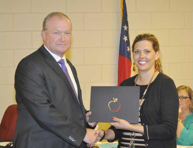 Effingham County Schools Superintendent Randy Shearouse presents the certificate from the state recognizing Kirbi Ratner as a Master Teacher.