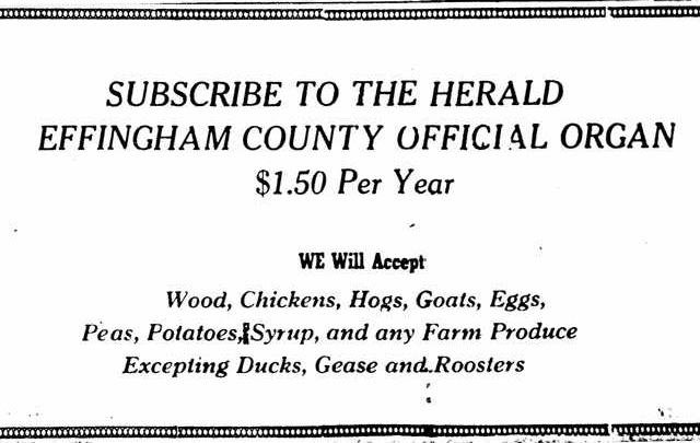 We will take any kind of produce you have for sale on subscriptions to the Herald. Next week we will quote prices for various items. (Signed) Editor.”