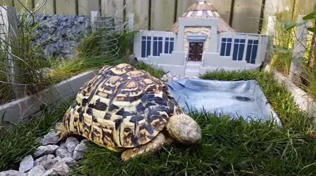 In the description of the video, owner Oliver Turpin wrote, I made a miniature Jurassic Park for my Leopard Tortoise Louie. It has grazing areas with seeds planted to grow as the weather gets better, a pool for him to drink/swim about in, a visitors center and the Jurassic Park gates.