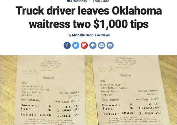 A Mississippi truck driver left one Oklahoma waitress a pretty sweet Mothers Day gift two tips of $1,000.