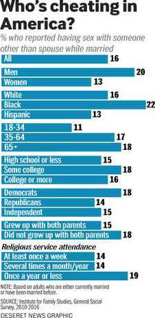 But even describing what cheating is has become more complicated than in the past as definitions and attitudes have changed over time. The most recent "Ten Today" poll conducted for the Deseret News found opinions vary about what even constitutes cheating. While that poll explored a range of possible definitions, Wang's analysis looked just at those who reported having sex with someone other than their spouse while they were married.