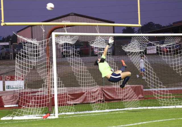 Lady Rebels goalie Sydney Martinez leaps to deflect a shot away from the net midway through the second half Thursday. Seconds earlier, Amber Whitten had given the Lady Mustangs a 1-0 lead.