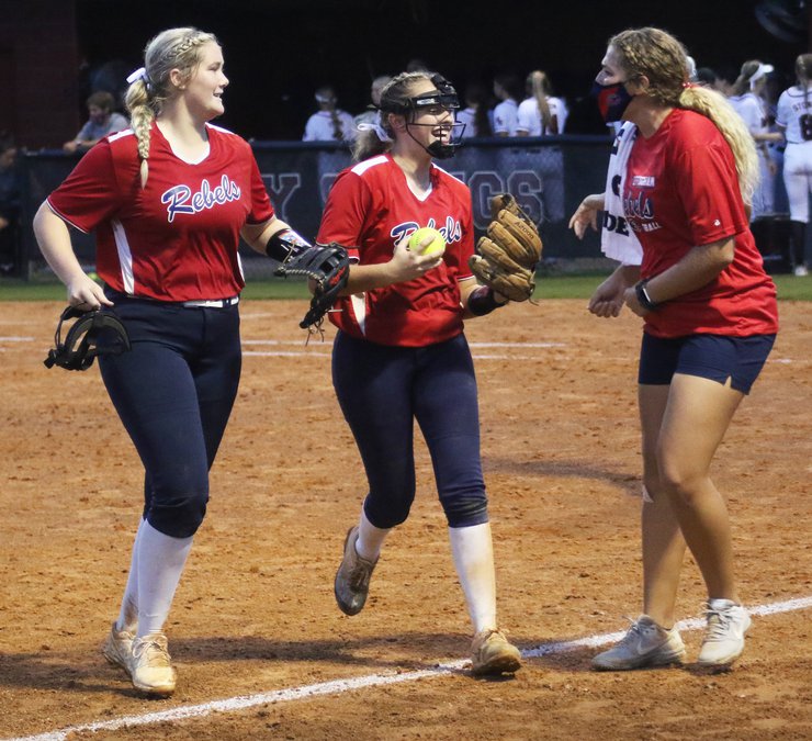 Like in the Aug. 26 meeting between the rivals that was aborted in the fourth inning due to lightning, the Lady Rebels (7-1, 5-0), winners of 24 straight region games, jumped to a 2-0 lead in the first frame. The runs came after Lauryn Wilson hit a soft fly ball that landed in front of a diving Kaley Stone for a two-RBI hit. The ball was quickly retrieved and returned to the infield where Wilson got caught in a rundown.