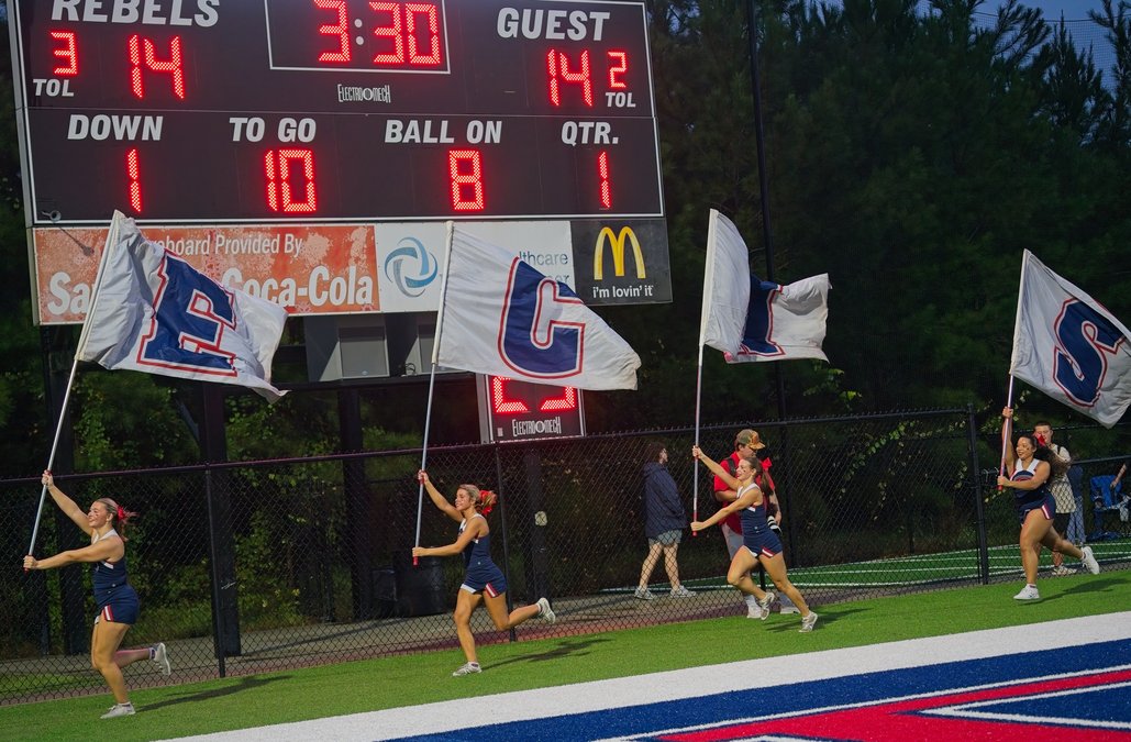 Effingham County cheerleaders run through the end zone carrying flags that spell out ‘ECHS,’ firing up fans in the misty rain.