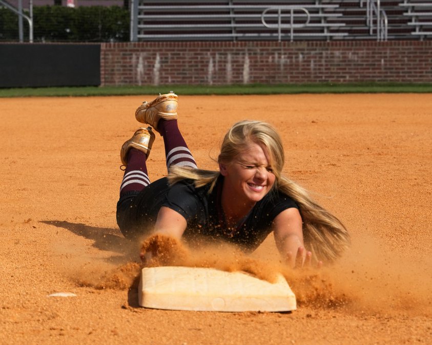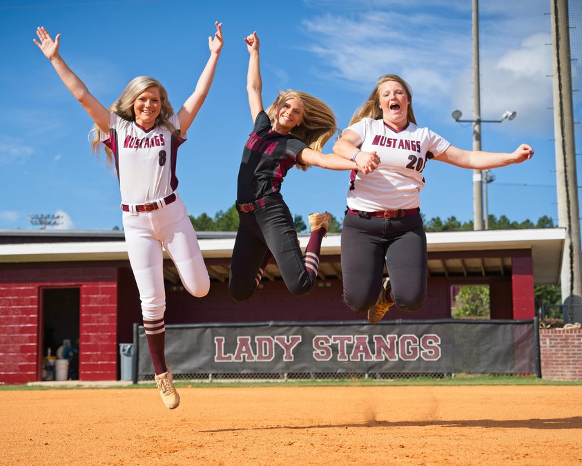 ABOVE: South Effingham's softball team conducted its Picture Day for the 2020-21 yearbook Friday. Shortstop Alex Brown went (above) all out for the occasion, sliding hard into third base. BELOW: Fellow seniors Caraline Stone (left) and Annabelle Sheley (right) join Brown in a unique photo.