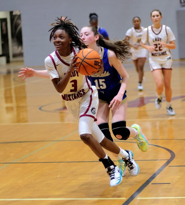 Sophomore point guard Kailyn Chapman led the Mustangs with 16 points. Alayiah Lewis added 13, Hayden Johanson 12 and Danni Lynn 10.