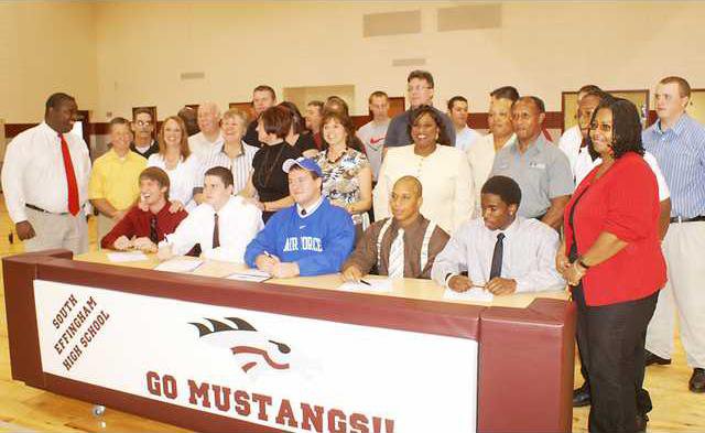 South Effingham High football coach Greg Manior stood behind five of his seniors as one by one they signed letters of intent Wednesday to play college football. Three Mustangs seniors — Jeff Hamilton, Josh Jackson and Frank King — will be teammates at Mississippi College. Jareb Tomberlin is headed to Albany State University and Cody Miller is taking flight to Colorado Springs, Colo., and the Air Force Academy.